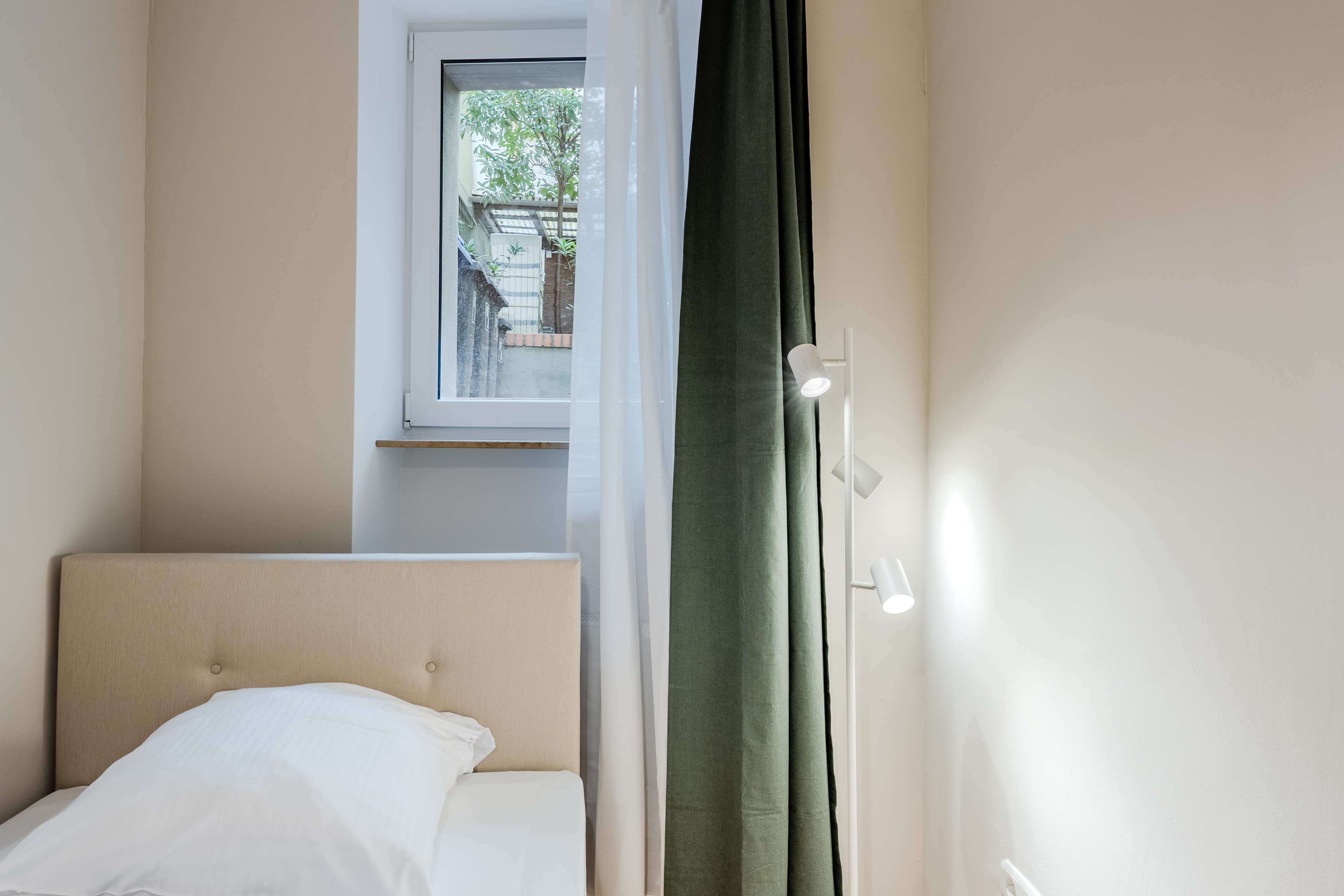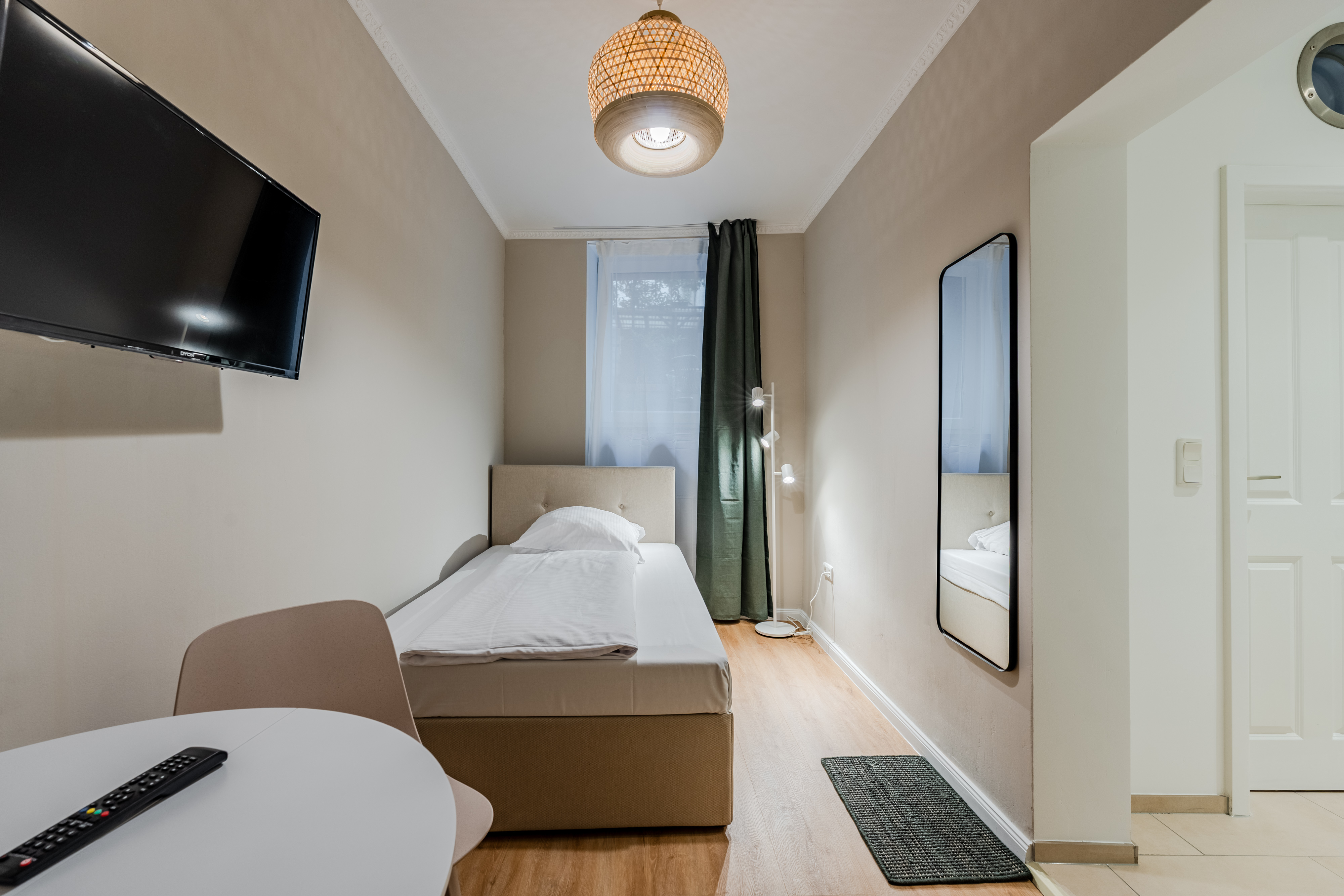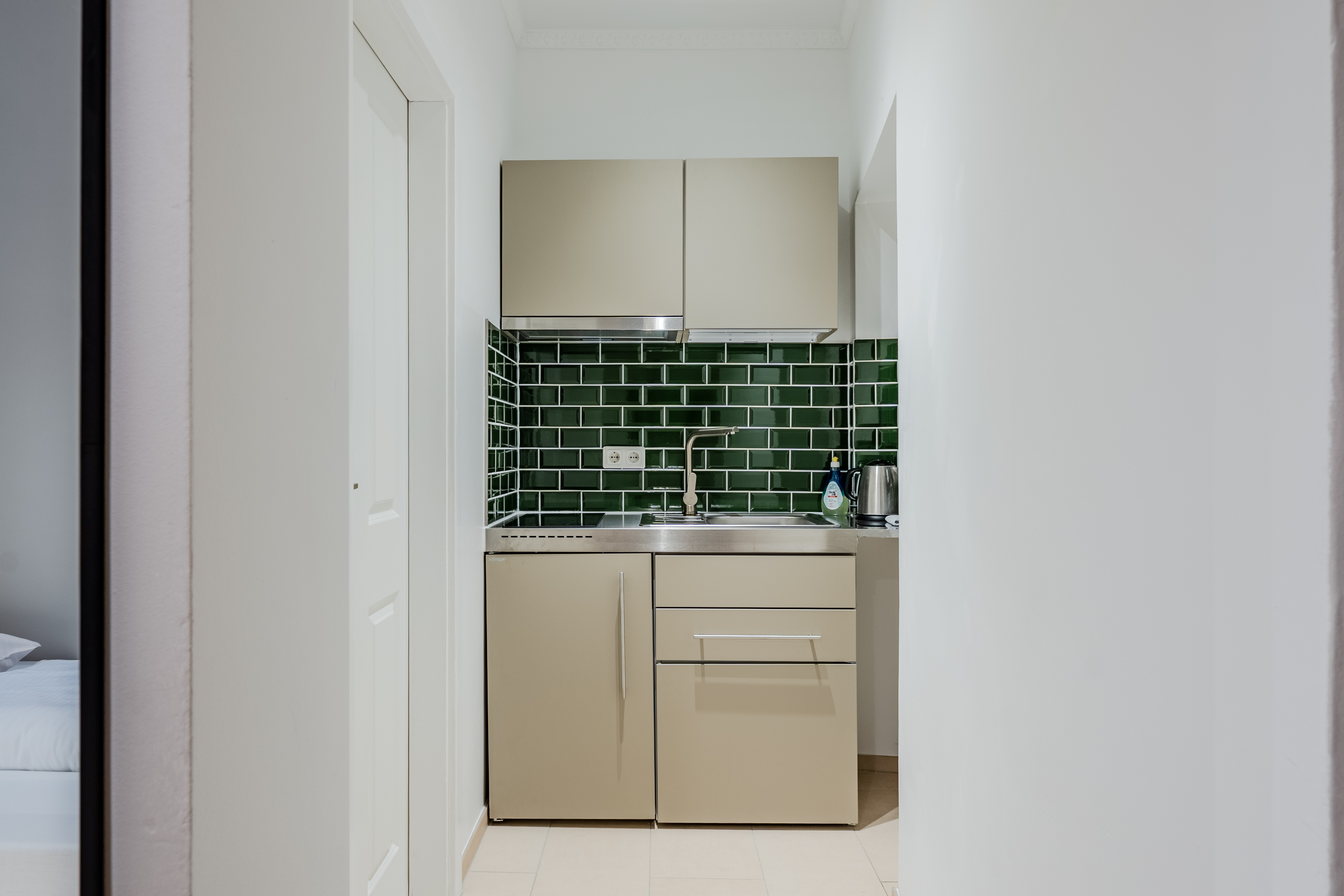 Das Apartment dieser Kategorie hat ein eigenes Badezimmer mit Dusche und ist mit einem 120er Bett, Tisch mit zwei Stühlen, Kleiderschrank, TV sowie einer Design Kitchenette ausgestattet. Diese bietet neben einem Herd und Kühlschrank auch Kaffeemaschine, Wasserkocher und notwendige Kochutensilien.